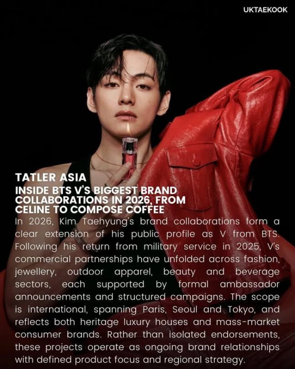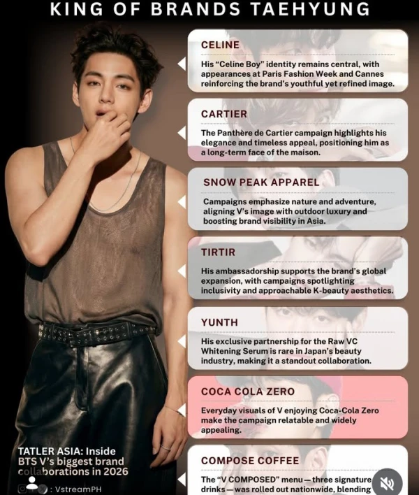 Kim Taehyung's (V) post-military career in 2026 reflects a broad, international influence across fashion, beauty, lifestyle, and F&B sectors. His partnerships are not one-off endorsements but long-term, strategically positioned ambassadorships that blend luxury heritage with mass-market appeal.🤩🤩🤩🤩🤩🤩🤩🤩🤩